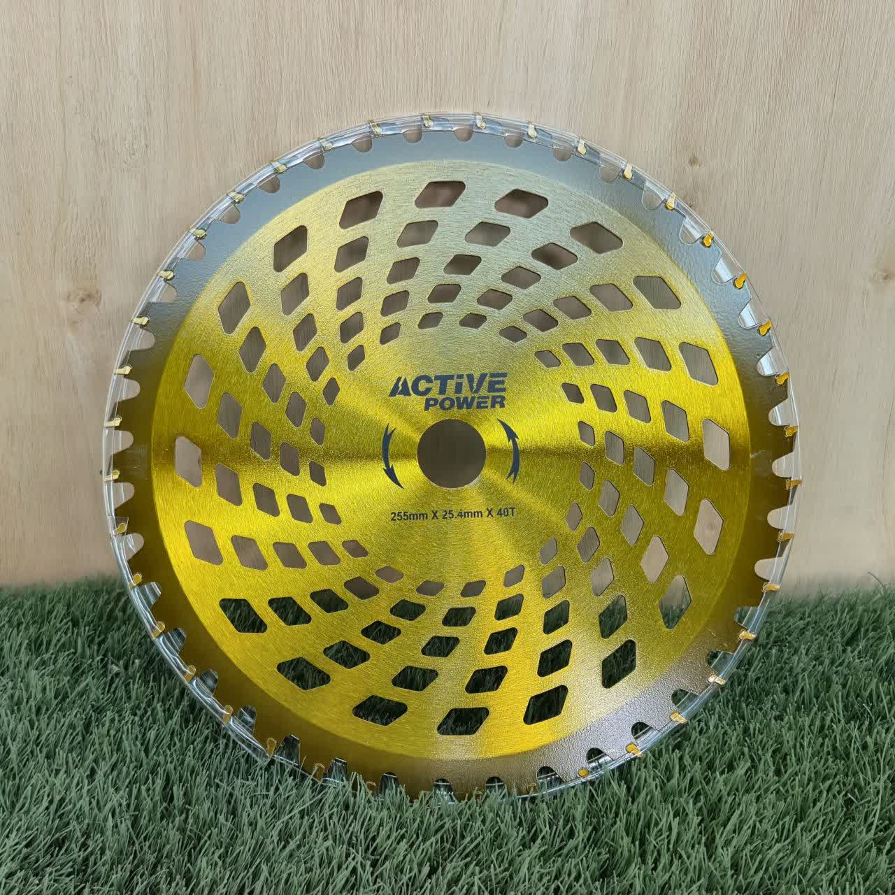 پارامترمشخصات فنی تعداد پره 40 عدد جنس تیغه فولاد کربنی با پوشش طلایی (Titanium Coating) قطر تیغه ۲۵-۳۰ سانتیمتر ضخامت تیغه ۲.۵-۳.۵ میلیمتر سوراخ مرکزی ۲۵.۴ میلیمتر حداکثر سرعت مجاز ۴۰۰۰-۵۰۰۰ دور بر دقیقه وزن ۱.۵-۲ کیلوگرم پوشش سطحی طلایی (Titanium Nitride)