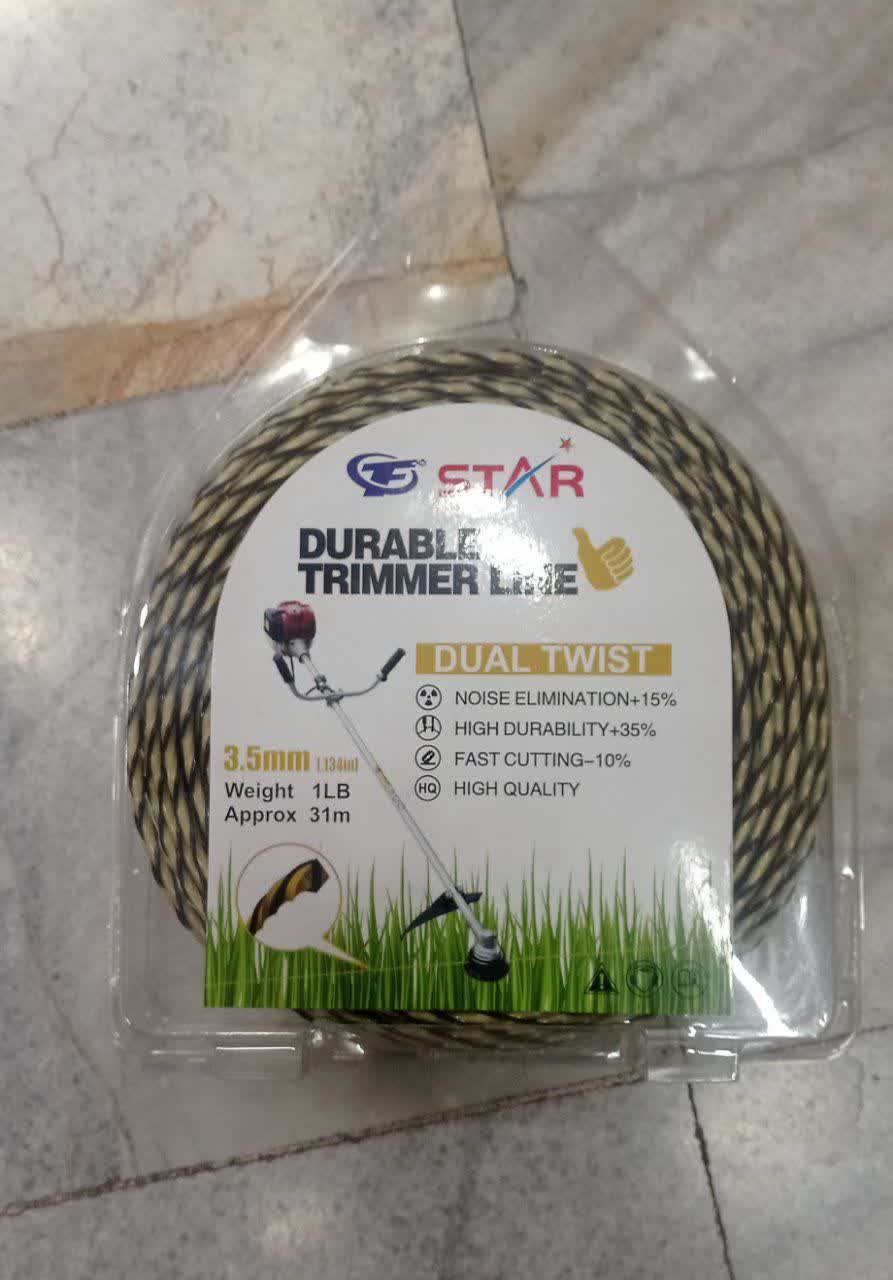 ویژگیمشخصات نوع محصول نخ چمنزن سایز (ضخامت) 3.5 میلیمتر طول نخ 42 متر بستهبندی رول متوسط پیچی رنگ طلایی و مشکی جنس نایلون مقاوم (معمولاً کوپلیمر) مقاومت در برابر سایش بالا مناسب برای چمنهای نرم تا نیمهسخت